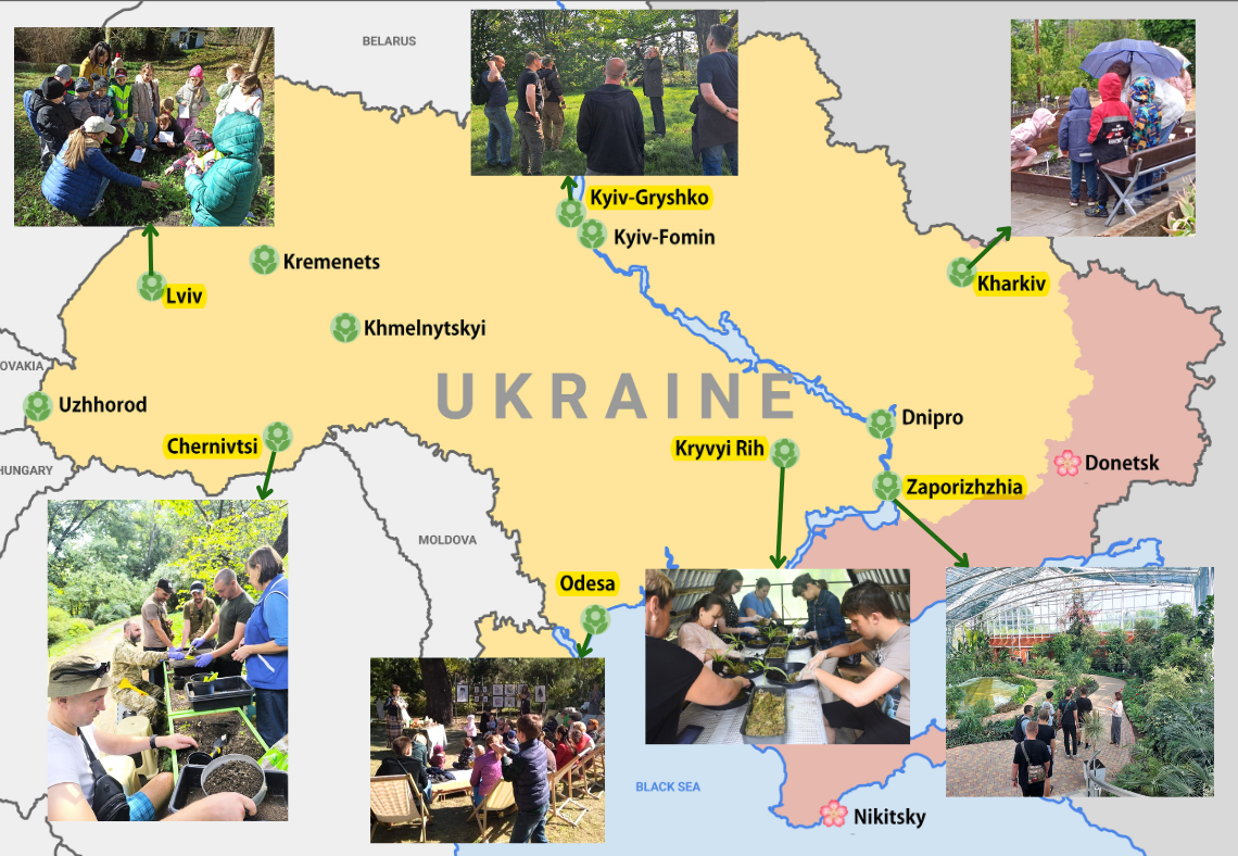 The map below shows programs at seven botanical gardens for children, families, veterans, and others in wartime Ukraine.